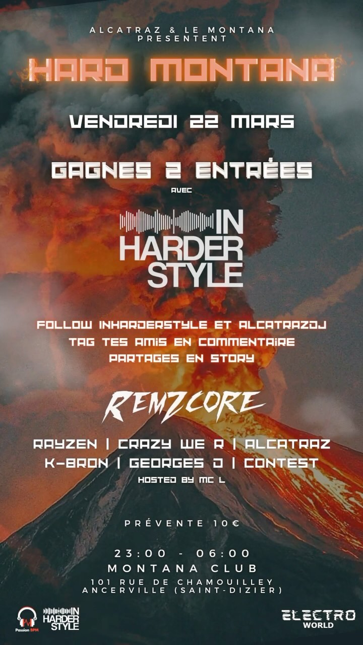 🎁Concours HARD MONTANA ⚠️ Le 22 mars prochain Alcatraz et le Montana vous présentent : HARD MONTANA, une grosse soirée hard en plein millieu de la région Grand Est ! Le line-up : Remzcore, Alcatraz, Crazy we are, Rayzen, K-bron , Georges D ainsi que le vainqueur du DJ contest 🥰 IHS est partenaire et t’offre 2 PLACES❗️ Pour participer, rien de plus facile : ▶️Aime notre page ainsi que celle de @alcatrazdj ▶️identifie ton équipe avec qui tu compte venir taper du pied !! ▶️ Partage en story cette publication ! *1 post / UNE CHANCE 🍀 Plus vous identifiez, plus vous faites de commentaires, plus vous aurez de chance ! Le tirage au sort aura lieu : Dimanche 17 mars à 20h alors bonne chance à tous 🤞🏻 Bonne chance à tous 🤞🏻!!! 🎟️: https://www.billetweb.fr/hard-montana-remzcore #ihs #concours #party #club #hardstyle